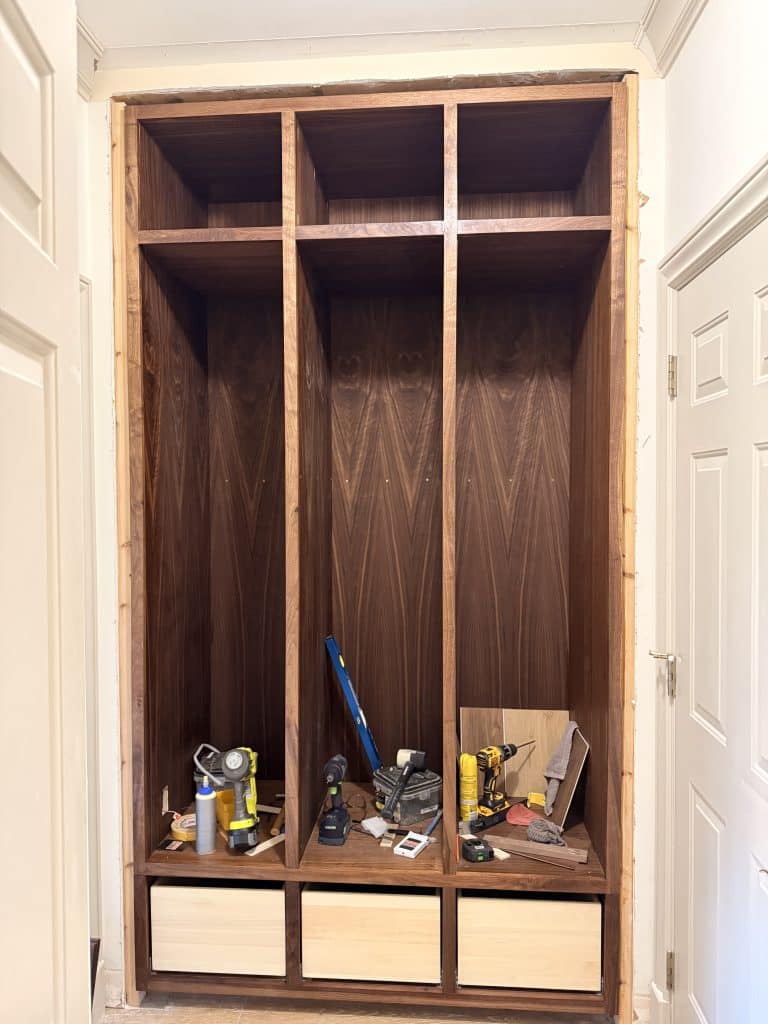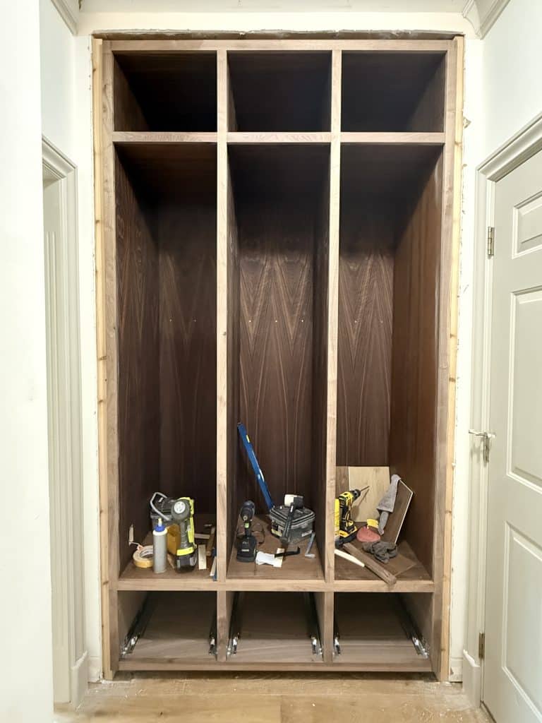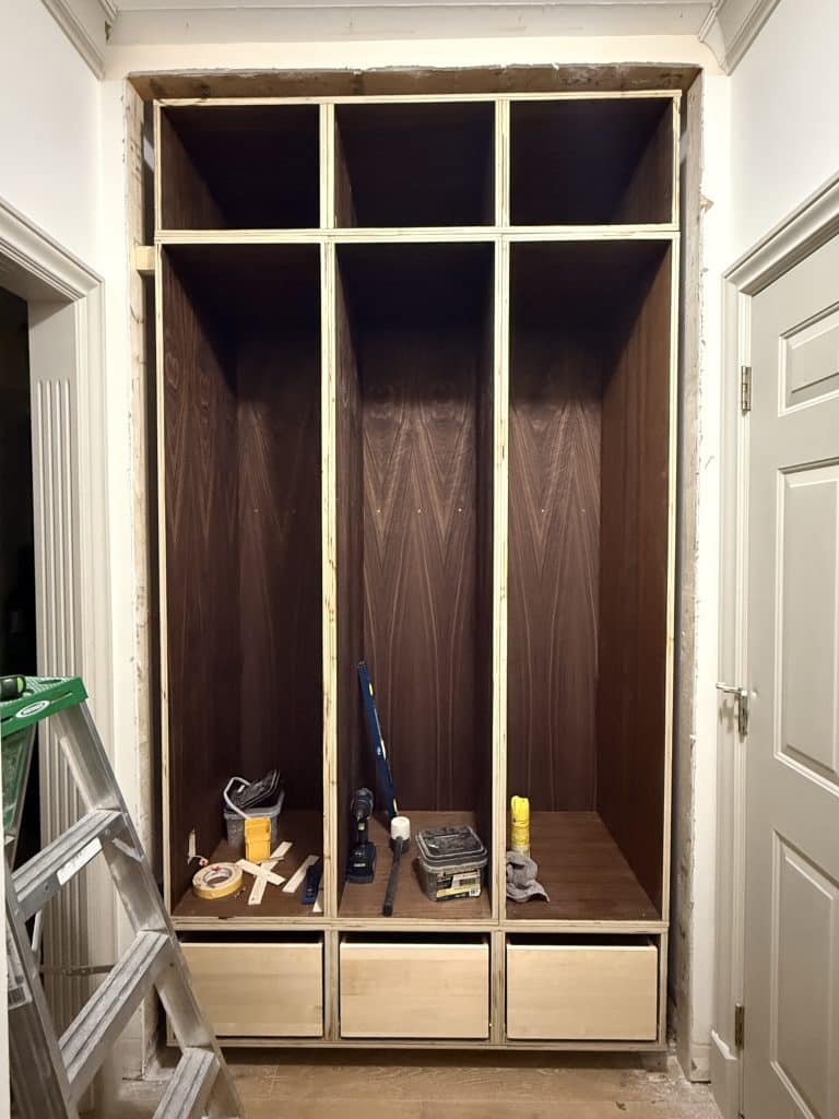 The face frame and trim pieces that come later will conceal those small imperfections and visually tie everything together into a polished, professional-looking built-in mudroom locker system.