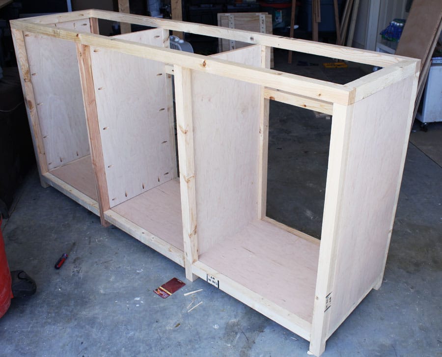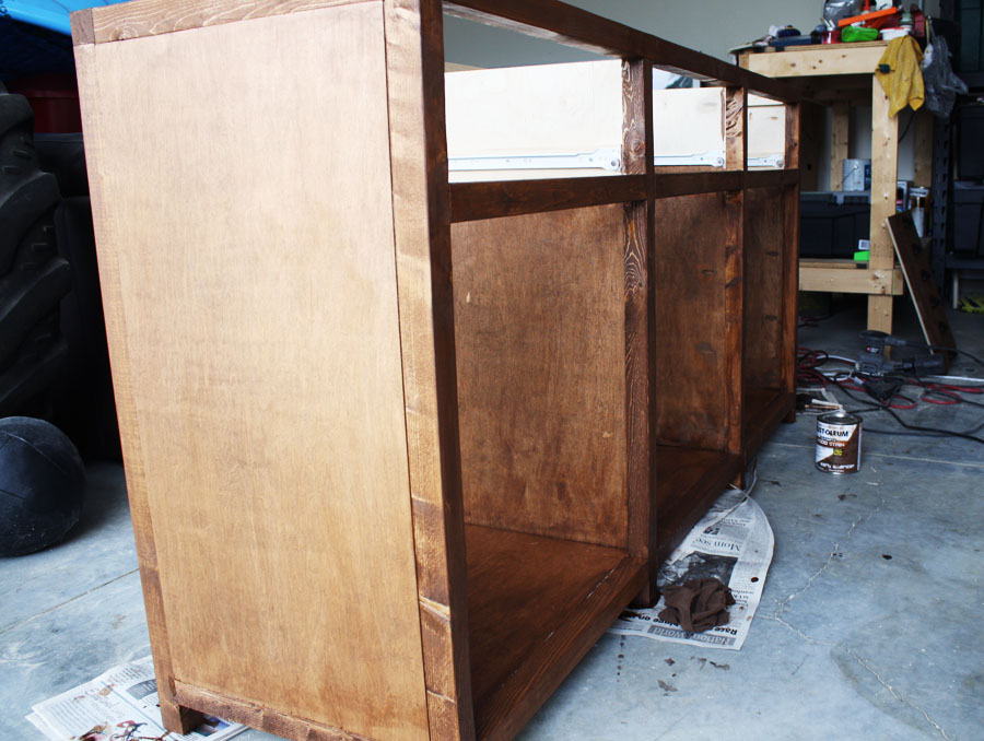 Building a piece with drawers was challenging, to say the least. This was my first rodeo working with drawers and drawer slides and there were more than a few foot-stomping moments, I’ll admit. Here’s the most important thing about building drawers: make sure you check that they are SQUARE! If they’re not square, you’ll run into problems later (wonky drawers that don’t fit, align onto the drawer slides, or slide in and out smoothly). And even if your drawers are square, you still may have problems if the space you’re putting them in isn’t square. Needless to say, even after my meticulous measuring, cutting, and building, my drawers were still a little frustrating to deal with. Also, you may want to deviate from the plan and measure the drawer space and build accordingly, just to be sure they’ll fit. Each of my drawers fits a specific space, as in, I can only put the middle drawer in the middle space. One more thing worth mentioning: SHIMS! Pick up a package of shims (they’re really inexpensive) because they are the stuff of carpentry magic! I used shims on 2 of my 3 drawers to square them up and make them slide smoothly.