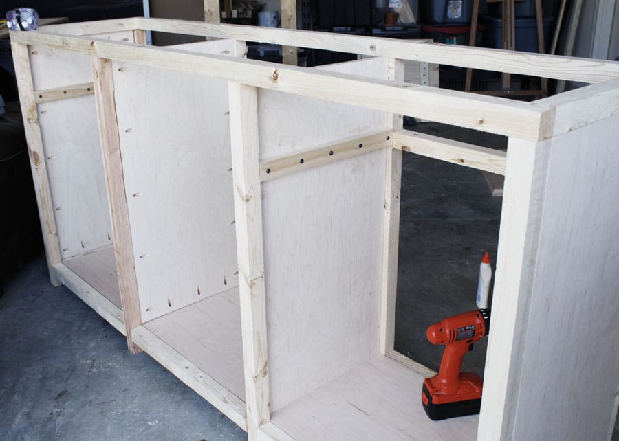 The top 3 drawers are real drawers, so I attached some 1×2 boards to support the drawer slides: