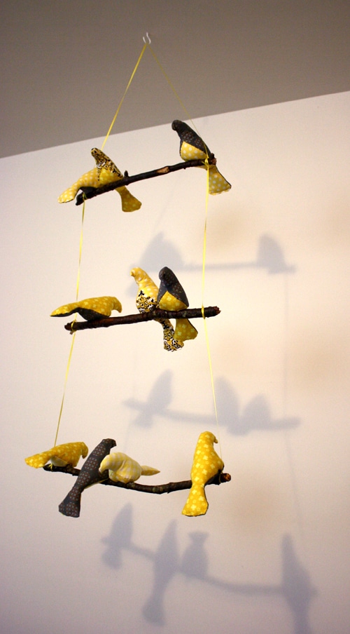 The birdies are finished. Whew! Next, I found 3 branches outside and sealed them up with a coat of Mod Podge, then sewed the birds onto the branches. I used a thin satin ribbon to tie the 3 branches together and hung the entire thing from the ceiling. It’s a bit of a balancing act to get the birds all sitting on top of the branch, so I suggest waiting until the whole thing is hung and then adjusting from there.