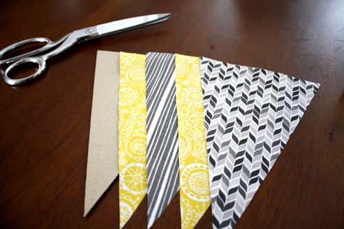 2) Cut out two pieces of fabric for each pennant. Since Evie’s nursery has a yellow and grey color scheme, I chose fabric in those colors.