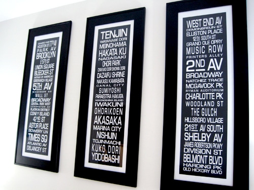 These are great. I did a similar one with street names. I wish I would have seen these first. . . framing them seems so much easier. Well done.