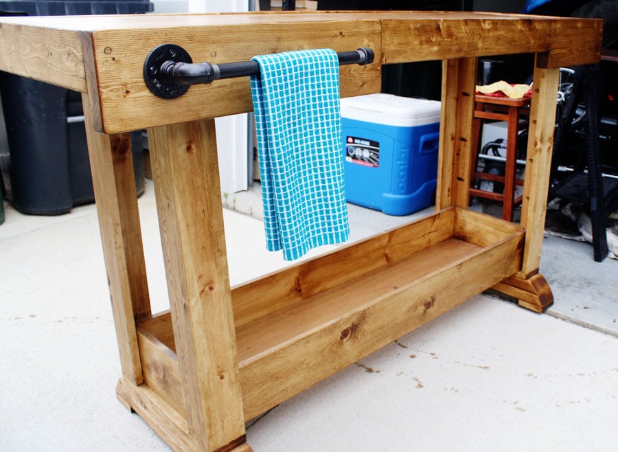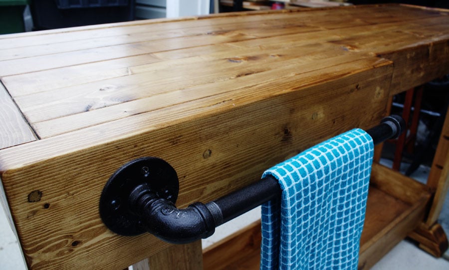 I love how rustic and hefty it looks. I especially love the curved detail of the feet and the industrial towel bar. And I’m psyched that I finally get to use the mitering feature on my compound miter saw! Is it just me, or does anyone else get this giddy over power tools?