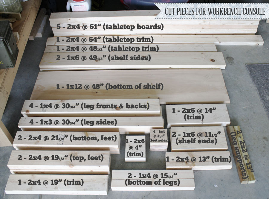 Check out the plans for exact measurements: http://ana-white.com/2010/09/workbench-console.html