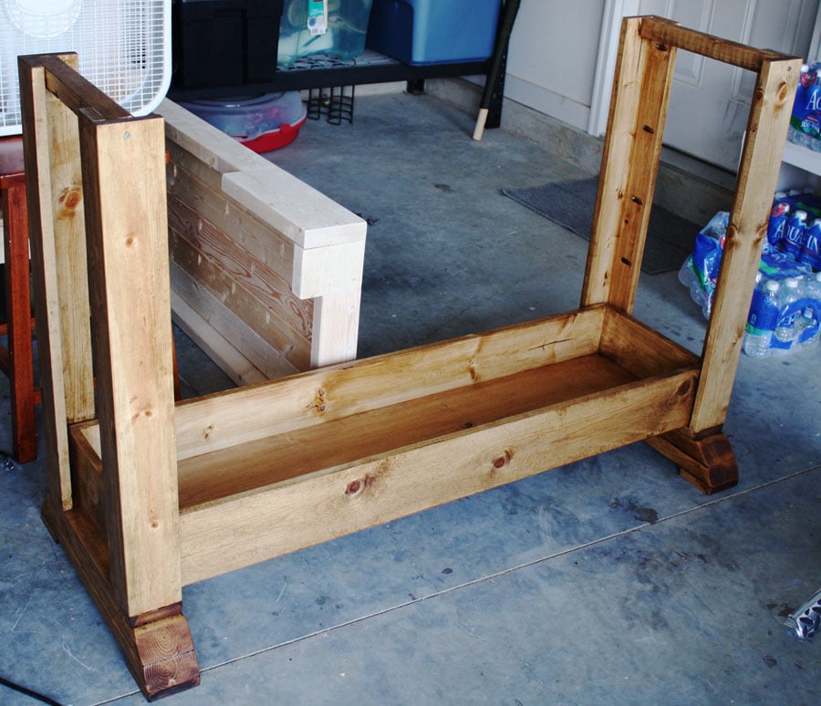 This table is pretty heavy, so I thought it would be wiser to handle each piece separately, instead of building it completely and then trying to manage such a heavy weight. I don’t want to send myself into early labor; I still have 5 weeks left! I also thought it would be easier to stain each piece separately and then put it together, instead of trying to bend, twist, and crouch to get every nook and cranny stained, so that’s what I ended up doing. I’m so glad I did, too, because there’s no way I would’ve gotten all the corners and sides stained successfully. Anya chose this warm golden oak color. Ooh, ahh… purrrrty, isn’t it? And look at the curved feet on this piece: pretty cool, right? Solid!