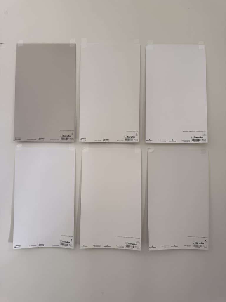 It’s always a good idea to get a paint swatch up on the wall to see what it looks like in the light at varying times of day. I typically paint a swatch on several different walls and see what the color looks like in the morning, noon, afternoon, and early evening. As soon as I painted Accessible Beige and Pure White on the wall, I knew they weren’t right. I narrowed it down to these four white paint colors: