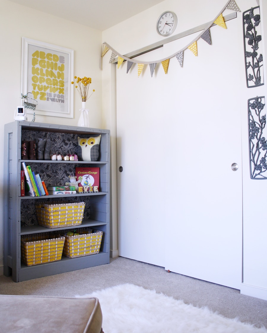 I revamped an old bookshelf that was collecting dust in our garage, sewed the fabric bunting banner, and owl pillow: